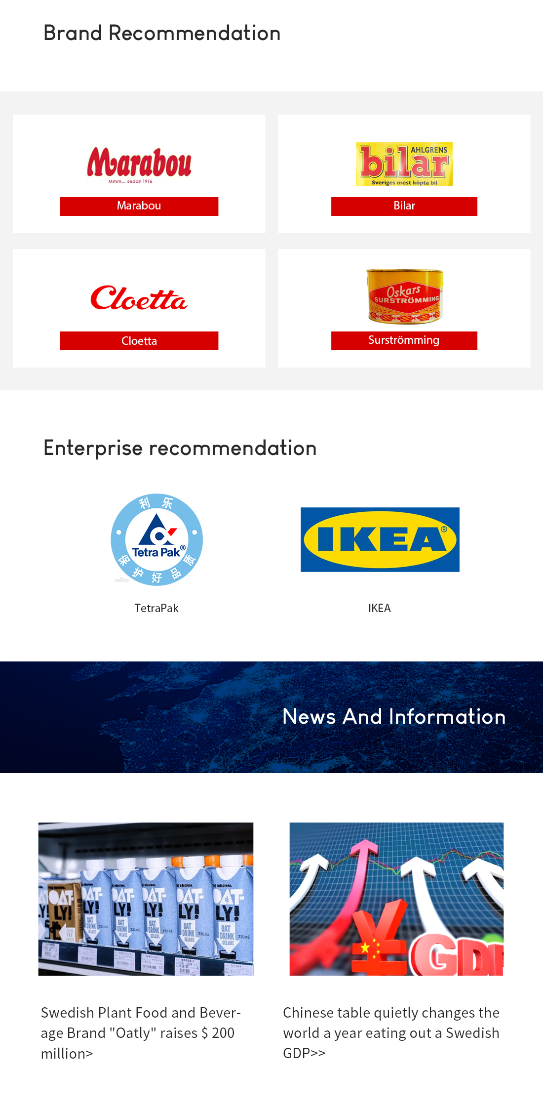 Sweden was the first Western country to establish diplomatic relations with China (establishing diplomatic ties in May 1950). In all stages of development in China, China and Switzerland have always maintained good economic and trade cooperation relations. Swedish enterprises took the lead in setting up representative offices, joint ventures, wholly owned enterprises and research and development centers in China. In recent years, bilateral trade, technical cooperation and two-way investment have made great development.