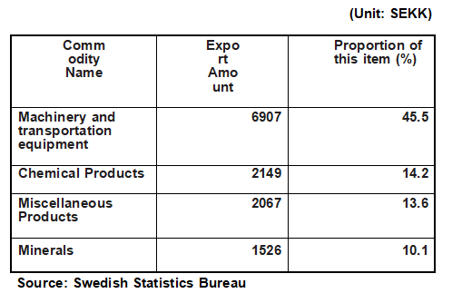Swedish industry is mainly assembly industry, largely dependent on imported goods, most of the goods are imported out of industrial needs. Mechanical and electrical products, mineral products and transport equipment are the main imported commodities in Sweden.