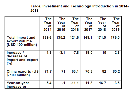 The dependence of foreign trade is high. In 2019, the trade volume of foreign goods was 3.019 trillion, the import volume was about 1.501 trillion, increased by 1% year on year, the export volume was about 1.518 trillion, up 5% year on year, and the trade surplus was 17 billion.
