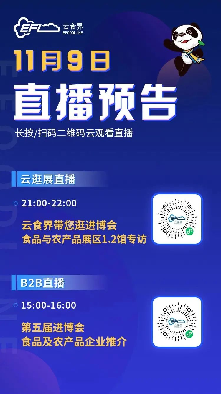 “云食界”平台为无法亲自前往第五届进博会食品农产品展区现场的采购商们提供线上推介服务。我们将于11月9日15:00-16:00安排第五届进博会食品及农产品企业直播推介。您只要通过我们的直播间,就可以了解到云食界交易展团的企业信息。