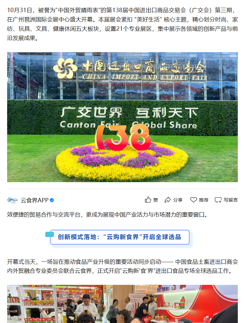 第138届广交会第三期启幕:“云购新食界”激活食品产业内外贸协同新动能