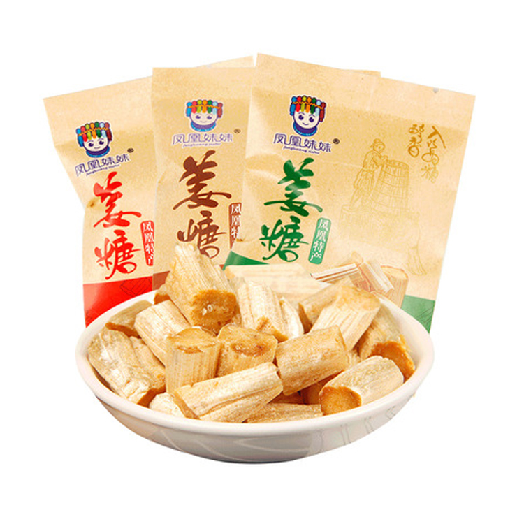 凤凰姜糖自清乾隆沿袭下来,一直在湘西地盘流传,至20世纪60年代中断。三年困难时期的“苦日子”,人们食不裹腹,农民不种生姜,食糖断绝供应,使得姜糖无料加工,在近四十年时间里姜糖在市面上销声匿迹。20世纪末,当中国改革开放的强劲东风在祖国大地上已吹拂了近20年,凤凰姜糖这久藏闺阁人已忘的稀罕物才古董般地被搬出市场亮相。虽是摸着石头过河,却在如林的洋包装糖物面前居然站稳了脚根,赢得了人们的喜爱。