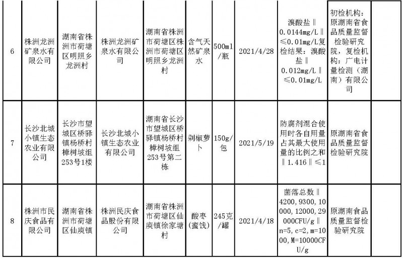 此外,还有2批次食品不合格,分别为株洲龙洲矿泉水有限公司生产销售的含气天然矿泉水经原湖南省食品质量监督检验研究院检验发现,溴酸盐检测值不符合食品安全国家标准规定;岳阳楼区宏勇食品批发部销售的,标称临湘市华一食品有限公司生产的豆瓣酱,经原湖南省食品质量监督检验研究院检验发现,黄曲霉毒素B1检测值不符合食品安全国家标准规定。