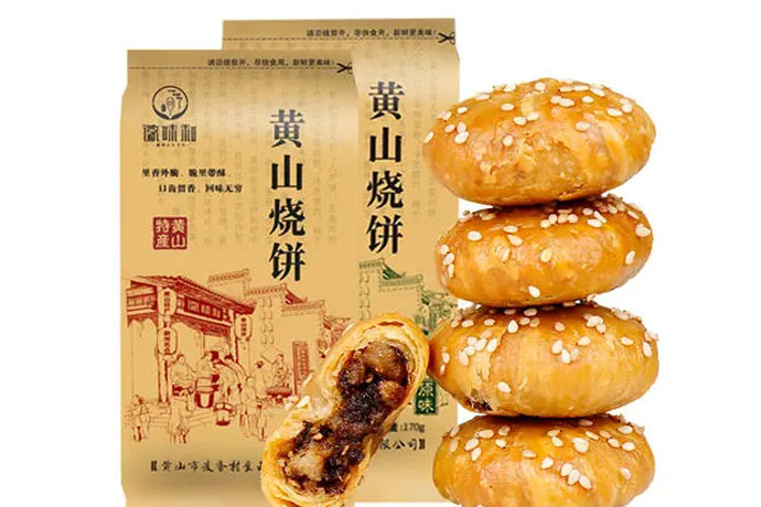 黄山烧饼又名皇印烧饼、救驾烧饼、蟹壳黄烧饼,是安徽省黄山市的一种特色传统小吃。刚出炉的黄山烧饼色泽金黄,吃起来酥脆爽口,油而不腻,令人回味无穷。黄山烧饼本是古徽州的地方小吃,面团揉匀饧透后,放入炉壁边,经过木炭烘烤而成。由于个头小,携带方便,且烘烤时间长,水分大多蒸发,不易变质,当年曾随徽商走遍大江南北,名气也越来越大。