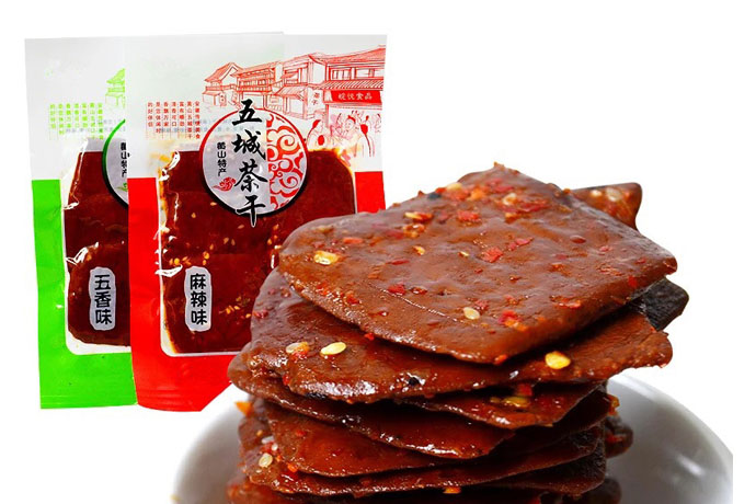 五城茶干,安徽省休宁县特产,国家地理标志产品。五城茶干为徽州传统特产,始创于南宋末年理宗时期,工艺成熟于元代,隆盛于清。五城茶干咸淡相宜,质纯味鲜,柔韧香醇,营养丰富,是品茗之佐餐,下酒之佳肴,老幼皆宜之美味食品。五城茶干色泽红棕色,色泽均匀、有油润感滋味咸甜适中、香气浓厚、质地组织细密、对折不断、柔软有劲、有弹性。茶干选用优质大豆、甘草等十几种天然材料精制而成。且色泽酱红、细嚼味长、回味持久、有韧性、对折不断等特色。除含丰富的植物蛋白外,还含有人体所需的十八种氨基酸,以及钙、镁、钼、锰、硒、锶、铜等十几种微量元素。