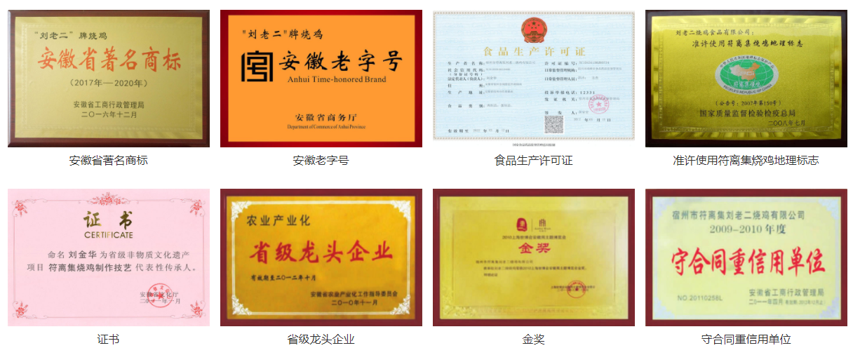 “刘老二”牌商标已连续十多年被评为安徽省著名商标,二零一八年六月又被评为“安徽老字号”,因此刘老二牌烧鸡成为了家喻户晓的美食品牌。现在的“刘老二”牌,不仅是一个品牌,而是符离集烧鸡的文化体现,也是宿州对外地宣传的一张名片。