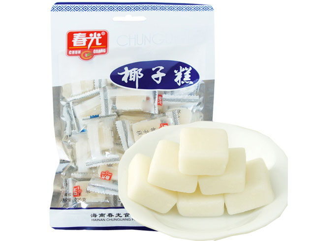 椰子糕是海南的一种特色小吃,它与年糕一样都有绵软的特点。但不同的是,海口椰子糕的最大特色就是它的馅,一般有椰丝花生馅和椰林芝麻馅两种。在椰汁糕外面包着椰叶散发的香味,更能够提起人的食欲。拨开糕底的香蕉芭蕉叶,椰子糕就散发出一种若有若无的香味,吃上一口,糯米的粘牙感和韧劲,让人难以忘怀。椰子糕是由葡萄糖浆、白砂糖、鲜椰子汁、糯米纸原料精制而成。椰子糕除了具有年糕的绵软特点外,其超Q是最大的特色,甜而不腻中夹着一丝丝韧劲,软软的、绵绵的,外观上椰子糕色泽明,光滑洁亮,赏心悦目,诱人食欲,入口清爽,甜滑润喉。