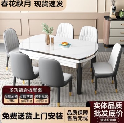 春花秋月岩板餐桌实木餐桌椅组合现代简约伸缩折叠圆桌小户型吃饭桌子