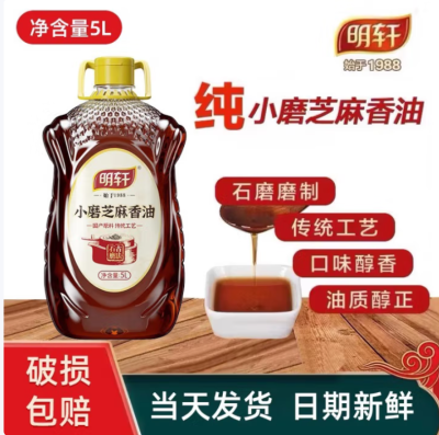明轩小磨芝麻香油纯芝麻磨制火锅油碟蘸料凉拌菜增香提味月子油家庭装 5L小磨香油