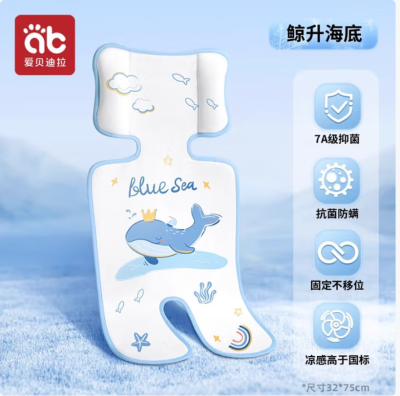 爱贝迪拉婴儿车凉席安全座椅凉垫子夏季通用冰丝遛娃神器宝宝餐椅推车凉席 【升级加大7A抗菌】蓝鲸-可驱蚊 75*32cm