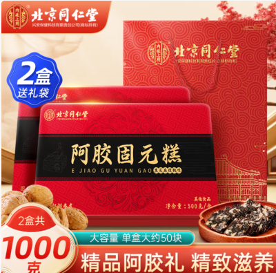北京同仁堂阿胶固元糕 阿胶糕 东阿县即食阿胶糕礼盒滋补品送礼女性长辈气血 【2盒共1000g】送1个礼袋