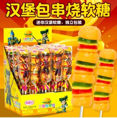 金稻谷小哪吒28克串烧汉堡软糖儿童零食棒棒糖盒装糖果便利店批发