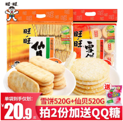 旺旺雪饼大礼包520g袋装仙贝零食整箱6袋 年货节儿童节旺仔零食休闲膨化米果饼干糙米饼小零食品 【2袋】雪饼1袋+仙贝1袋(共约120包X2片)