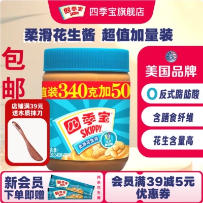 四季宝花生酱颗粒柔滑花生酱早餐面包酱拌面凉拌酱火锅蘸料烘焙花生酱 【加量装】柔滑花生酱340+50g