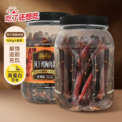 自然派风干鸡胸肉条500g罐装健身高蛋白代餐零食香辣味鸡肉干大桶