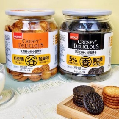 OCOCO308g无蔗糖谷物黑芝麻小圆饼干罐装酥脆零食办公解馋小吃批
