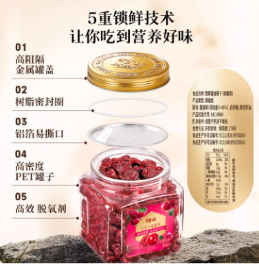 百草味智利蔓越莓干整颗大颗粒260g罐装果脯水果干休闲即食零食