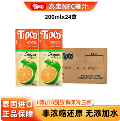 泰国进口泰宝tipco青橙汁nfc果汁整箱200ml*24小瓶儿童无添加饮料