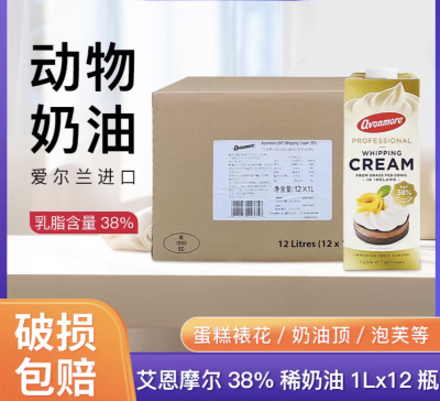 进口艾恩摩尔稀奶油38%爱尔兰1L*12盒整箱装淡奶油裱花奶茶动物奶