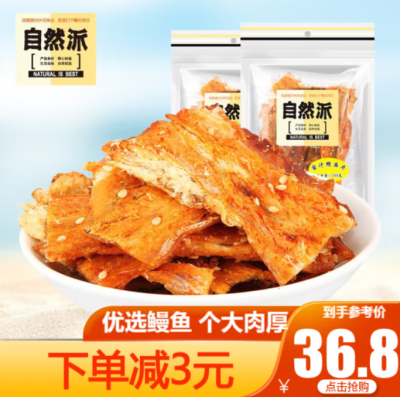 自然派【蜜汁鳗鱼100g*2】即食海鲜零食海味肉干办公室休闲零食