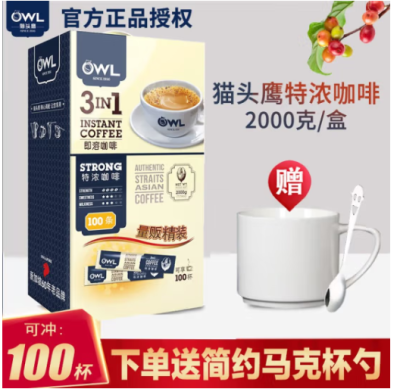 马来西亚进口 猫头鹰咖啡(OWL) 特浓三合一速溶咖啡粉2kg (100条x20g)量贩礼盒装 猫头鹰咖啡粉2kg*1【赠杯】