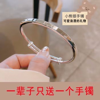 【七夕情人节礼物】森贝小熊银手镯女款银镯子推拉式女时尚饰品银饰女士年轻款首饰情侣送女友老婆生日礼物 白色
