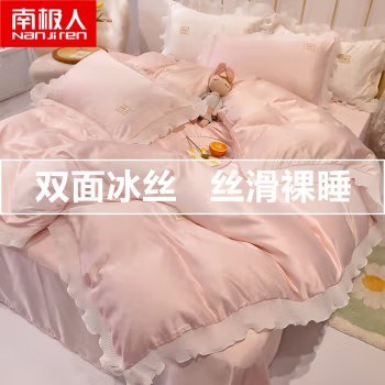南极人家纺 水洗冰丝四件套夏季凉感丝滑花边被套床单公主风被罩床笠单人双人1.5m1.8米春夏床上用品 花边款-粉玉-AM 1.8m床单款四件套【被套200*230cm】