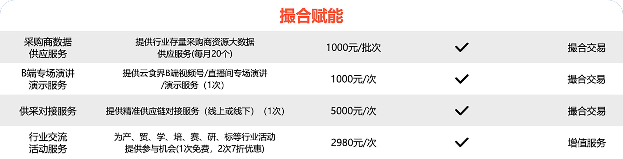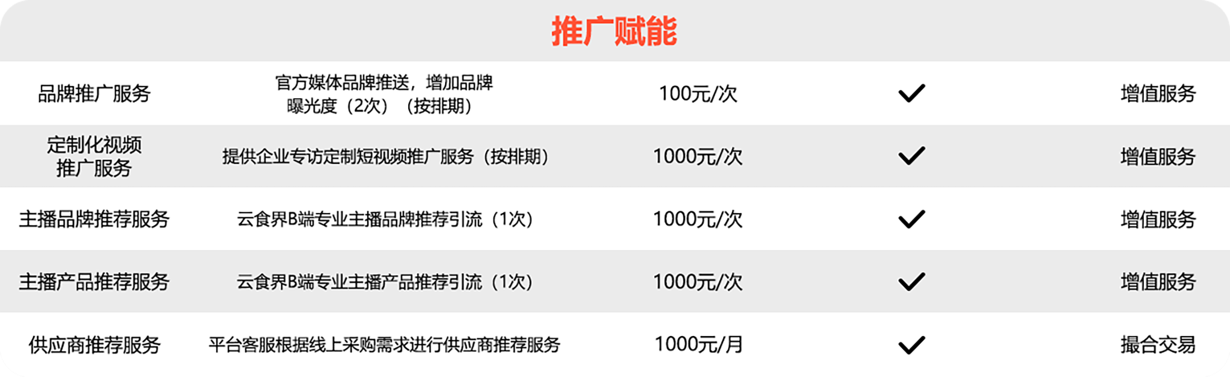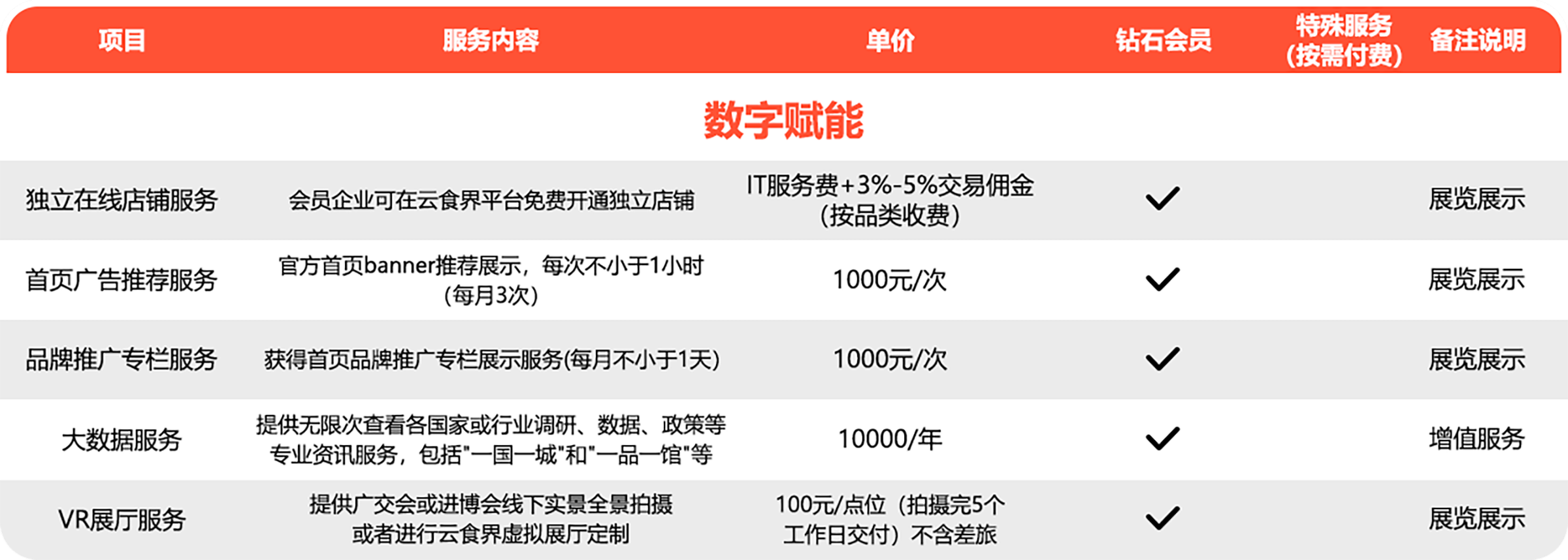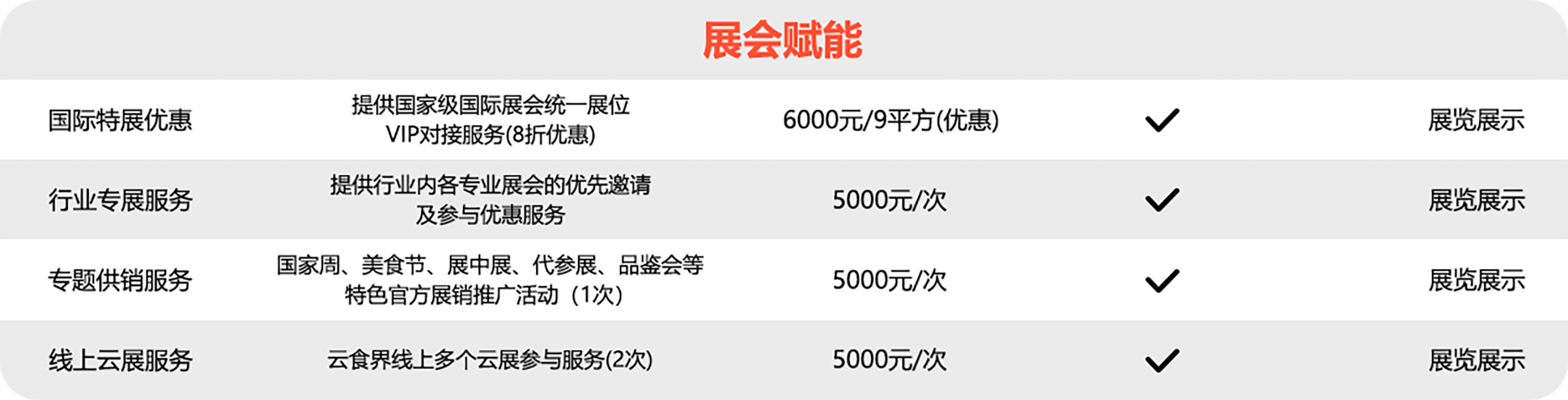 免费官方媒体、自媒体平台多渠道品牌营销服务、线上或线下系列活动的免费参与权等,如国家食品周、行业展会、企业专场对接会。